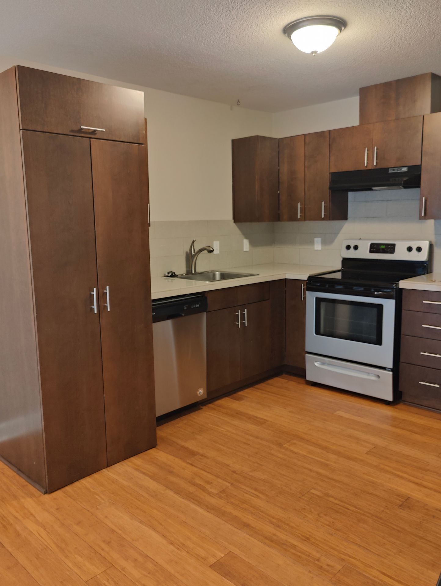 --Modern kitchen appliances including smooth-top range, fridge, full-sized dishwasher, disposal and vent hood.