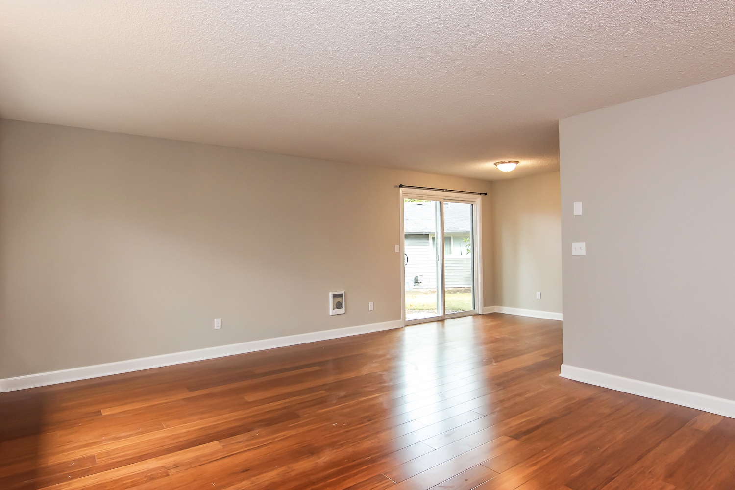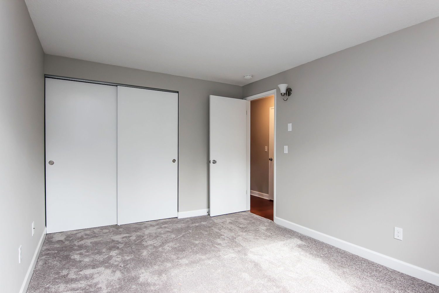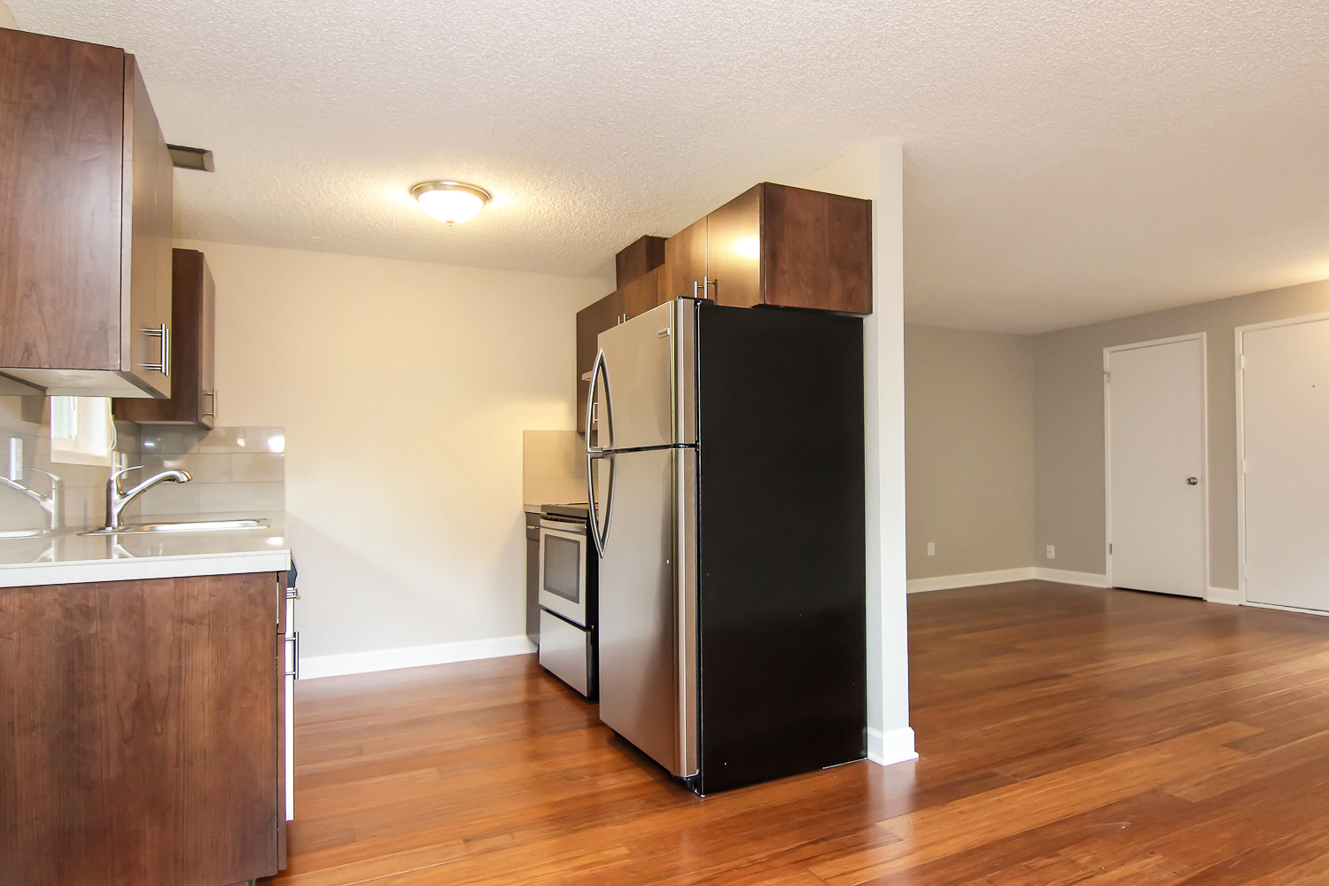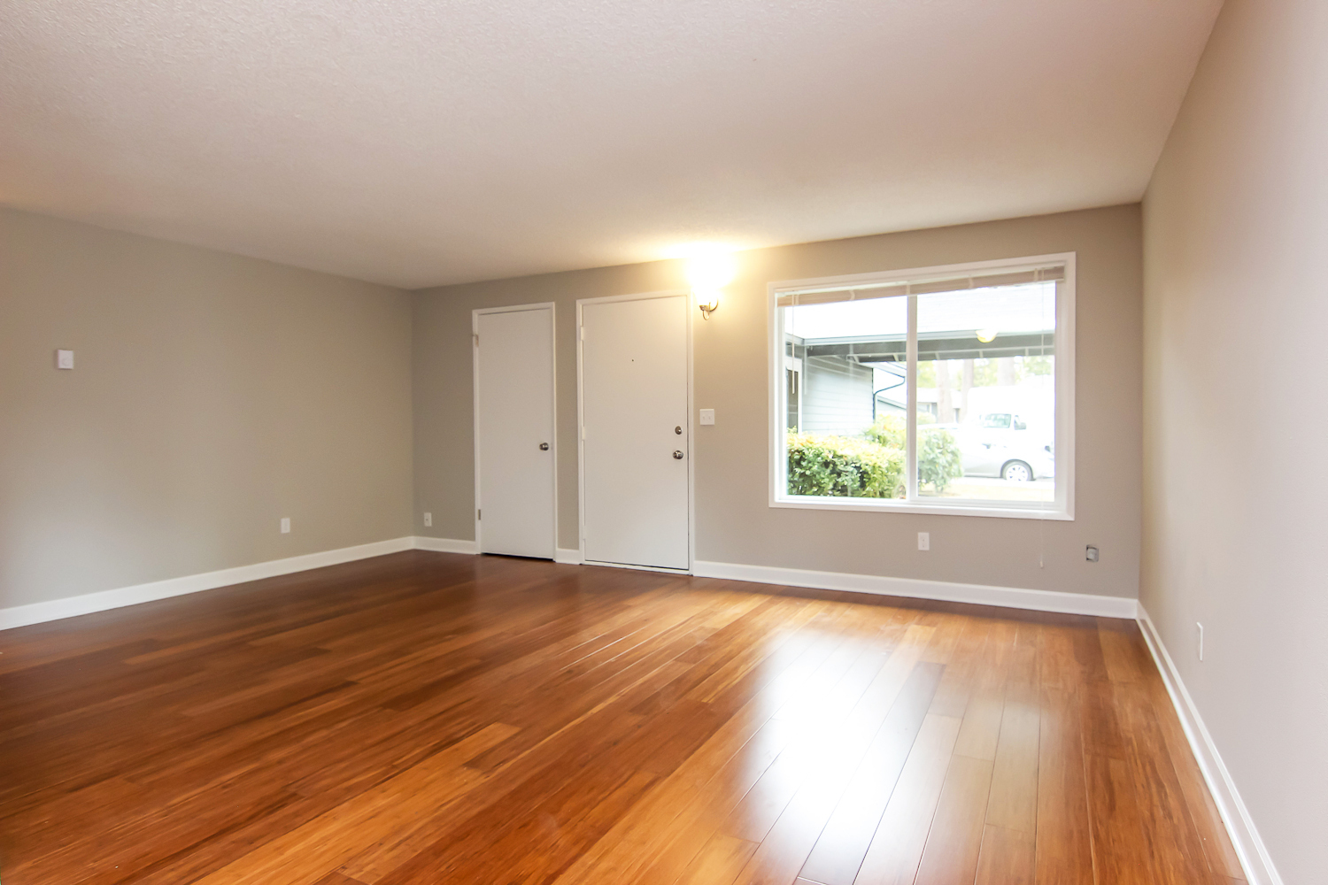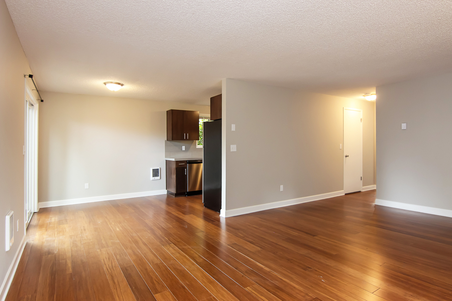 --Hardwood flooring in the kitchen and living areas and carpet in the bedrooms.