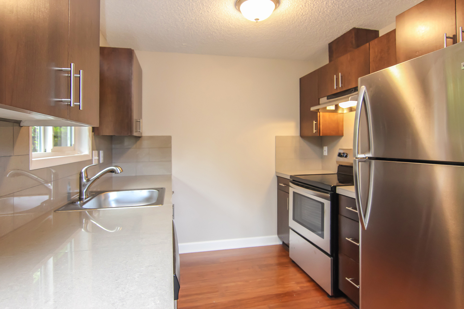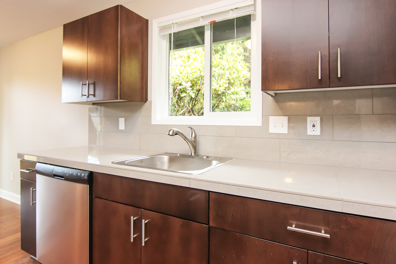 --Contemporary dark wood cherry cabinets with stainless steel pulls.