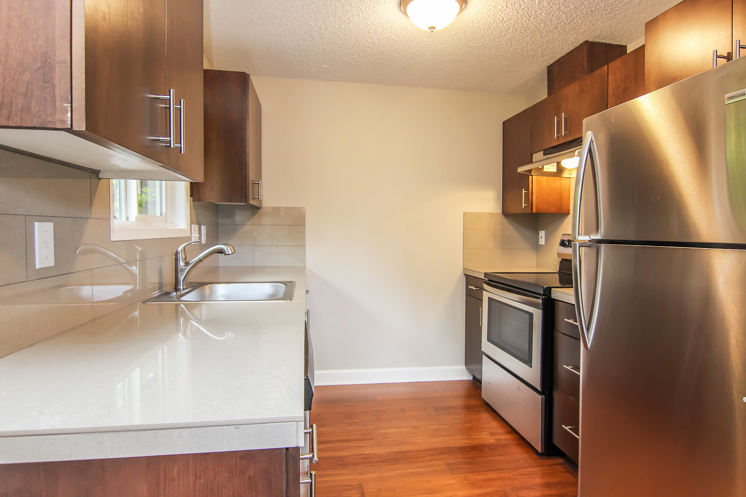 --Modern kitchen appliances including smooth-top range, fridge, full-sized dishwasher, disposal and vent hood.