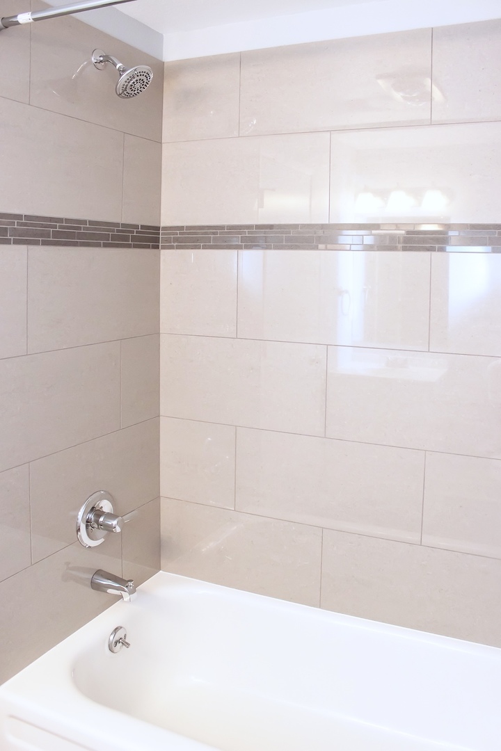 --Stylish tile, mirror, tub, lighting and fixtures in the bathroom.