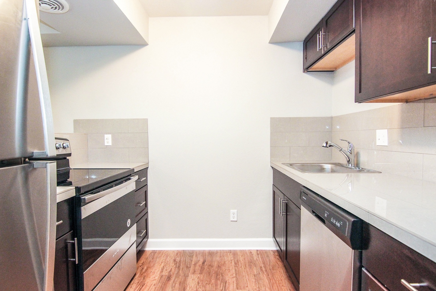 --Modern kitchen appliances including smooth-top range, fridge, full-sized dishwasher, disposal and vent hood.